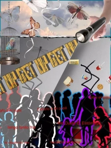 As we move up in the photo, we see more of the food that is falling from the sky, just a few things that are given to the children. These meals are given three times a day, but they lack what is needed for these children shows how little it is. The flashlight represents how these children are awakened every night to do a body count and all they say to them is 'get up.' I chose this font because I wanted to capture the boldness of this font as well as the scariness of these guards. Most of these children do not speak English so it would just sound scary and bold. We see a bird in a cage locked up. The bird represents the freedom of these children locked up in a cage as well. We see these insects flying away from the children some of them have a white ribbon around them. The white ribbon represents the loss of purity within these children. The butterfly is a metaphor for hope, love, souls, enteral nature, and the red dragonfly represents strength and courage. These insects are flying away from the children to show how easy it is to lose hope for most of them. The last insect that is trapped within the children is the dragonfly in the day which represents realizing maturity at a young age. Lastly, the barbed wire separates these children from the feelings they possibly no longer feel."