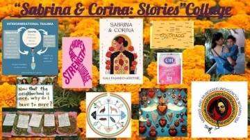 Josiah: "Sabrina & Corina: Stories has eleven chapters containing eleven different stories centered around young Indigenous-Mexican women in Colorado. I chose marigolds to be my background because they symbolize love and grief. Marigolds were mentioned in many of the stories. I also made the title font purple to symbolize grief and suffering. Many of the stories such as chapters 1. "Sugar Babies", 2. "Sabrina & Corina", 3. "Sisters", etc. deals with domestic violence and violence against Indigenous women, so I added the MMIW seal to represent the murdered and abused women in this book. I added an intergenerational trauma chart to show how extreme poverty, dysfunctional relationships, trauma and violence affects all generations, this was shown in chapters 6. "Galapago", 8. "Tomi" and 9. "Any Further West". I added a photo of a woman protesting about the gentrification of her home. This represents the grandmother and her grandchildren who had to move because of high prices and crime due to gentrification in chapter 6. "Galapago".