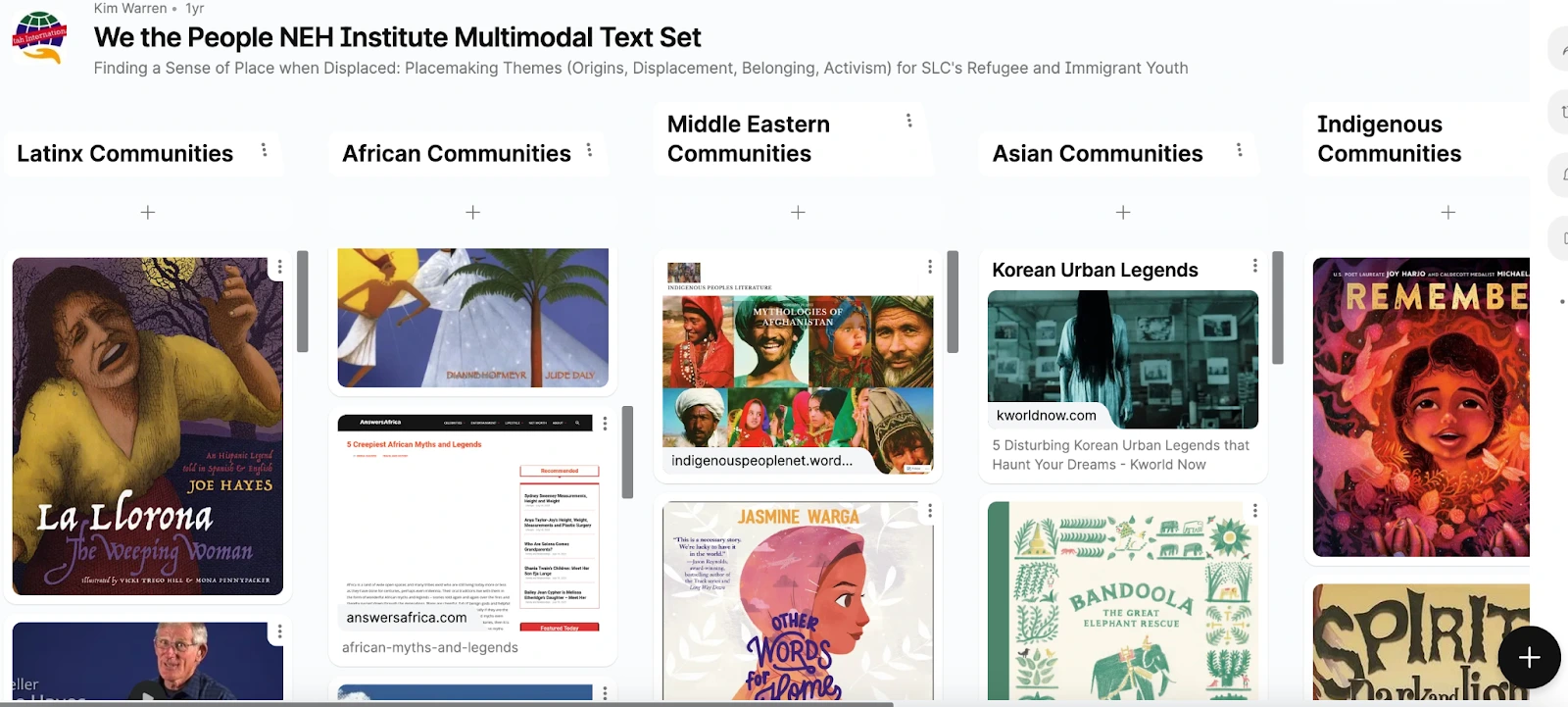 During the two-week institute, I worked with other educators to explore the theme of erased histories in conjunction with practices of humanities research methods through global literature, interactions with authors and scholars, museum visits, and hands-on inquiry. I was introduced to multiple global and multicultural texts that represent students, are age-appropriate for middle schoolers, and have proven accessible to a classroom of diverse languages and English abilities. I collected these titles in a digital, multimodal text set designed for middle school refugees and immigrants in the ELA classroom and centered around four diachronic themes. "Origins" explores legends, folktales, and myths from students' home countries. "Displacement" features characters, places, and stories students can relate to, as well as the fantasy genre. "Belonging" centers on stories about finding a sense of place when displaced. Finally, "Activism" features activists from students' home countries and current communities.