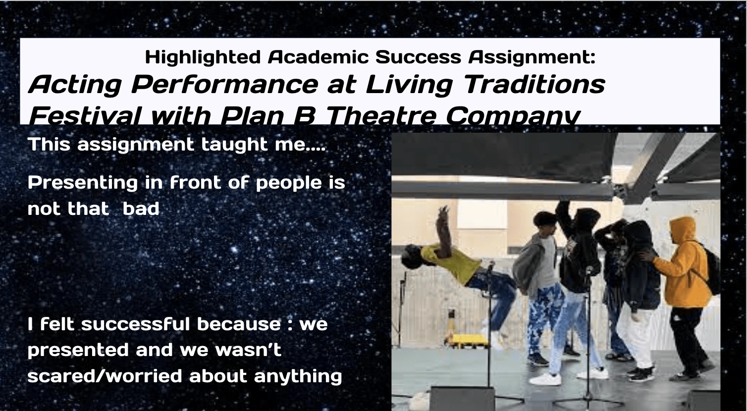 I extended this work in the spring with another community arts collaboration with Plan-B Theatre Company, which centered around representation to enhance arts education through playwriting. The theatre's talented, diverse professionals further extended student-centered learning with their residency's focus on representation and its rigorous yet fun curriculum, which ultimately benefited students by providing facilitators who were both role models and educators. The actor/teacher residents offered learning experiences and educational tools that upheld all student voices, especially those often marginalized or unheard in academic settings, and the residency shaped our spring semester into one of active participation and full-class engagement, as evidenced by significantly lower tardy and absentee rates during the program.