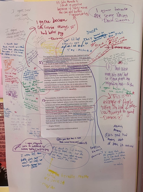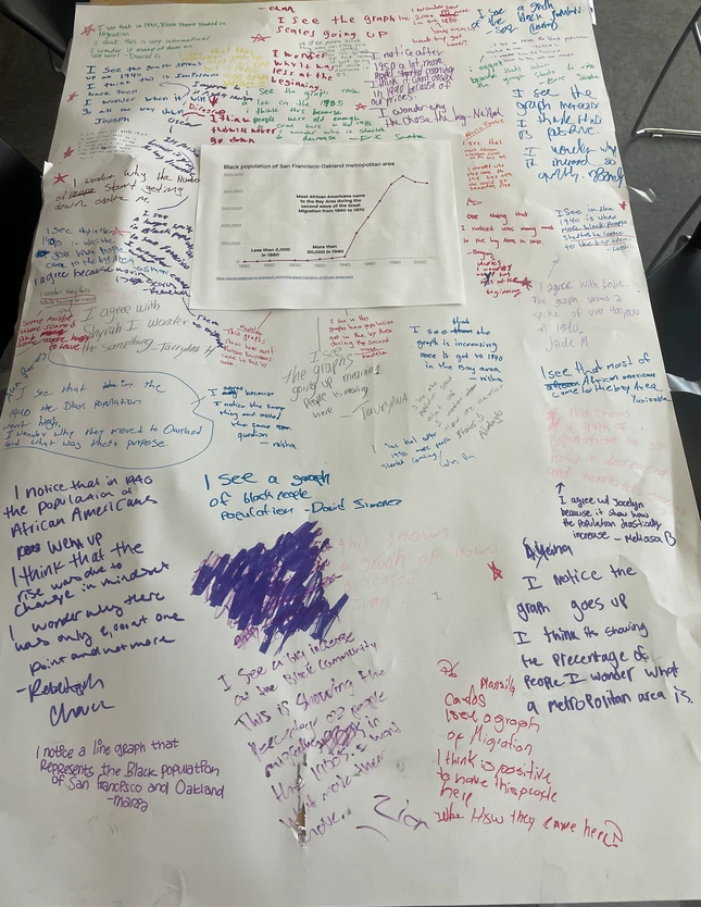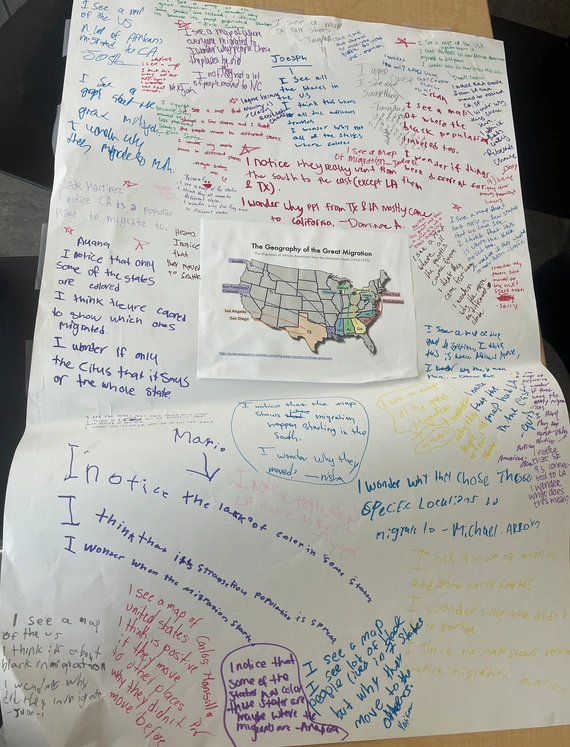 Using this discussion as a starting point for engagement, students then analyzed quotes about migration and brief descriptions of the Great Migration. We also examined a migration map from the Great Migration depicting the migration of Black families from the South to the North and the West, including the migration pattern into our own city of Oakland and the wider Bay Area.