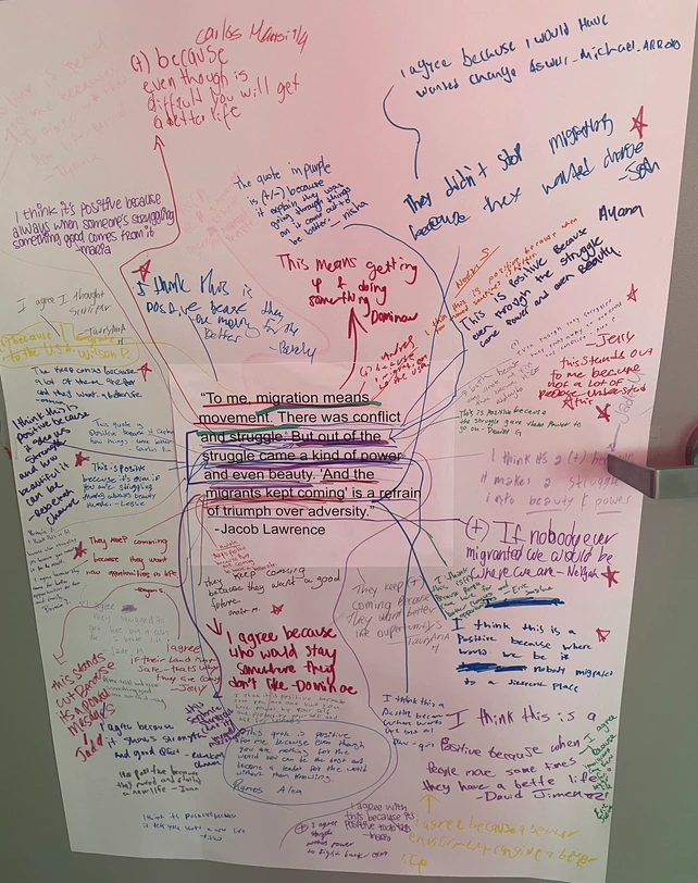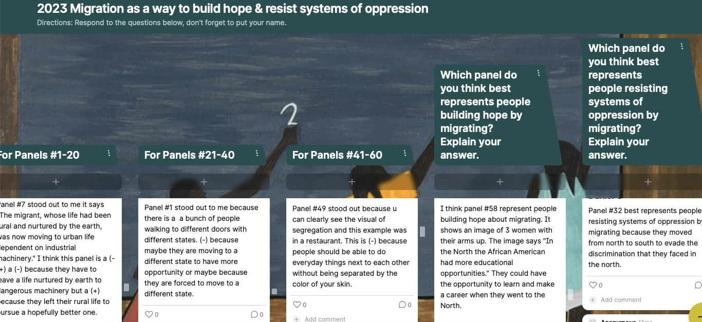 Lawrence has 60 panels with brief captions depicting the Great Migration of Black families moving from the South to the North and the West. In this way the artwork helped students visualize the process of migration which included the struggles and pain as well as the hopes and dreams of the migrants. I created a padlet where students chose different panels that stood out to them and they commented on the panels that most demonstrated migration as hope and migration as an act of resistance in the face of systems of oppression.