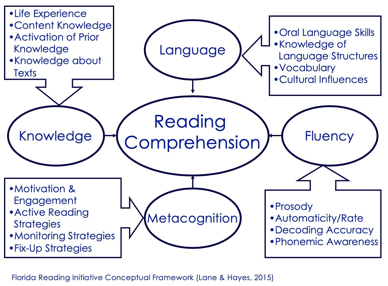 The Florida Reading Initiative (Lane & Hayes, 2015) developed such a framework designed to guide teacher knowledge development. With reading comprehension at its center, it includes four components and multiple subcomponents that influence and lead to skilled reading.