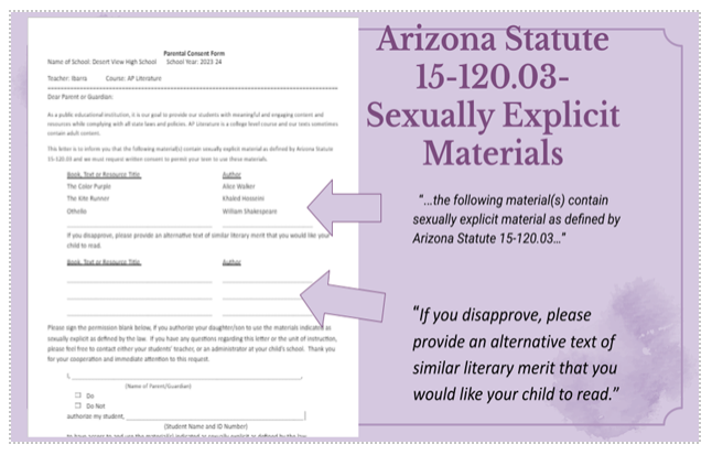What I have learned to be the easiest method of obtaining permission to read anything that might be considered sexually explicit is to send home a parent permission slip at the beginning of the school year with all the books I plan to teach each semester. One way this is helpful is that I don’t have to worry about obtaining permission multiple times. To keep things simple, I state “This letter is to inform you that the following material(s) contain sexually explicit material as defined by Arizona Statute 15-120.03 and we must request written consent to permit your student to use these materials.” I then list the books we’ll read and provide a space where a parent can write in an alternate title of similar literary merit if they disapprove. If a parent felt they were unable to do this, I provided some alternative titles.