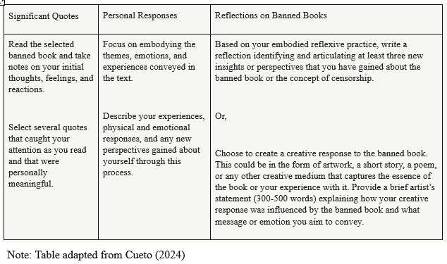 While I aimed to help students develop a well-rounded understanding of The Kite Runner, I also wanted to offer them a creative outlet for personal expression. To achieve this, I introduced a new method of reflection I learned in a class at the University of Arizona around the Embodied Reflexive Response (Cueto, 2024). This method utilizes a three-column chart where the first column is used for key quotes in the text, the center column is used for embodied responses to the text (paying attention to physical and emotional responses to the text while reading), and the final column is used for either an essay about the book that includes insights gained on censorship or an artistic response that includes an artist’s statement. This final column is used for their final project and is not to be completed until we finish reading the book.