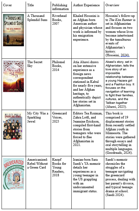 In addition, when I teach this unit again, I would like to offer more multimodal texts that support students’ learning about Afghanistan, the Taliban, and the broader socio-political context in which The Kite Runner is set. For example, short documentary videos, interviews with people from Afghanistan, and supplementary YA novels could help students engage with the text from multiple angles, enriching their reading experience. In the table below (Table III) I have created a table of books that could be helpful for students wanting to expand their understanding of the Middle East. I have elected to include relevant paratextual features, again, drawing on the methodology proposed by Durand et al (2021).